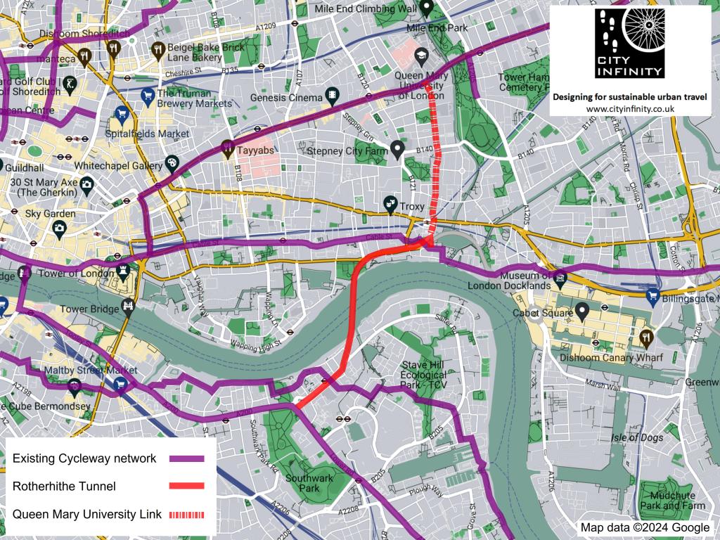 East London’s Cycleways – The Rotherhithe Tunnel would fill a significant active travel gap east of Tower Bridge and a link to Queen Mary University would deliver an even better network.