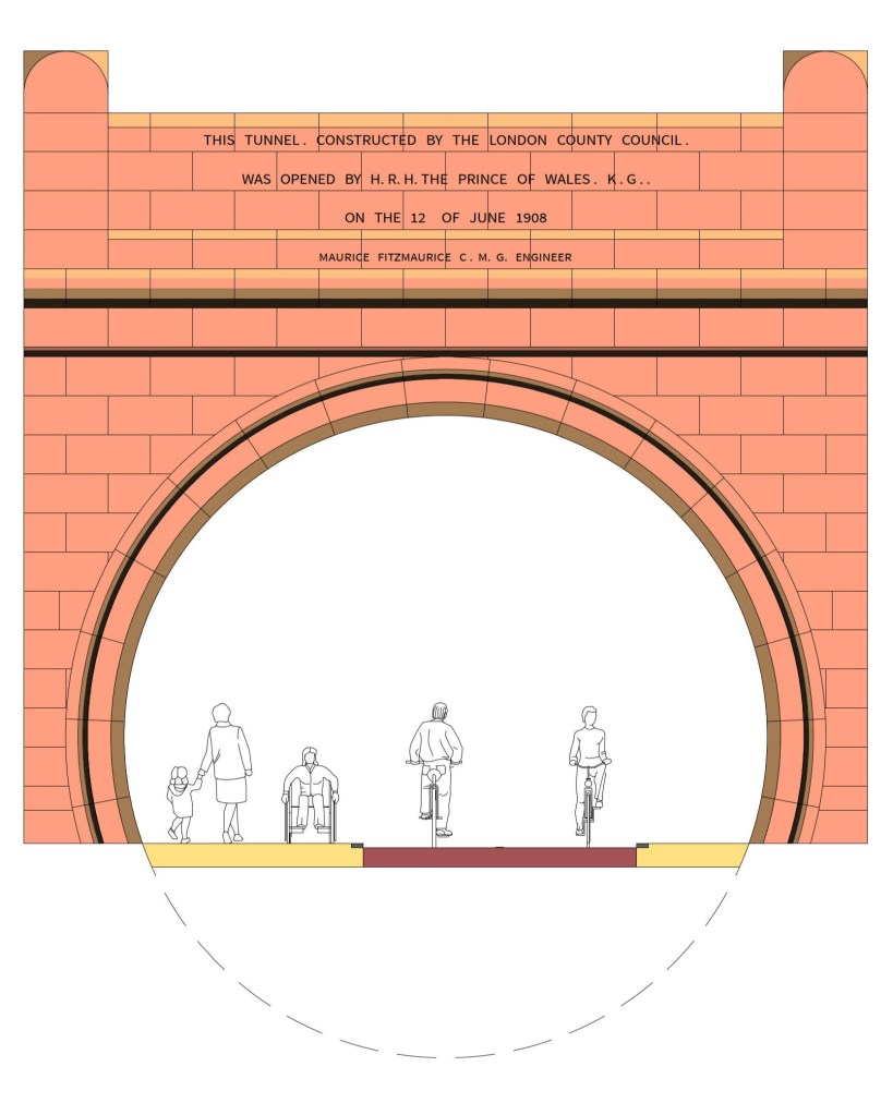 The tunnel opened in 1908 and was used by some 14,000 pedestrians and 2,600 vehicles a day (mostly horse drawn), but in common with many roads and streets in London, the growth of motorisation soon chased people away leaving motor traffic dominate the space. There have been periods where bus services were operated, but the last Transport for London operated service ended in 2006.